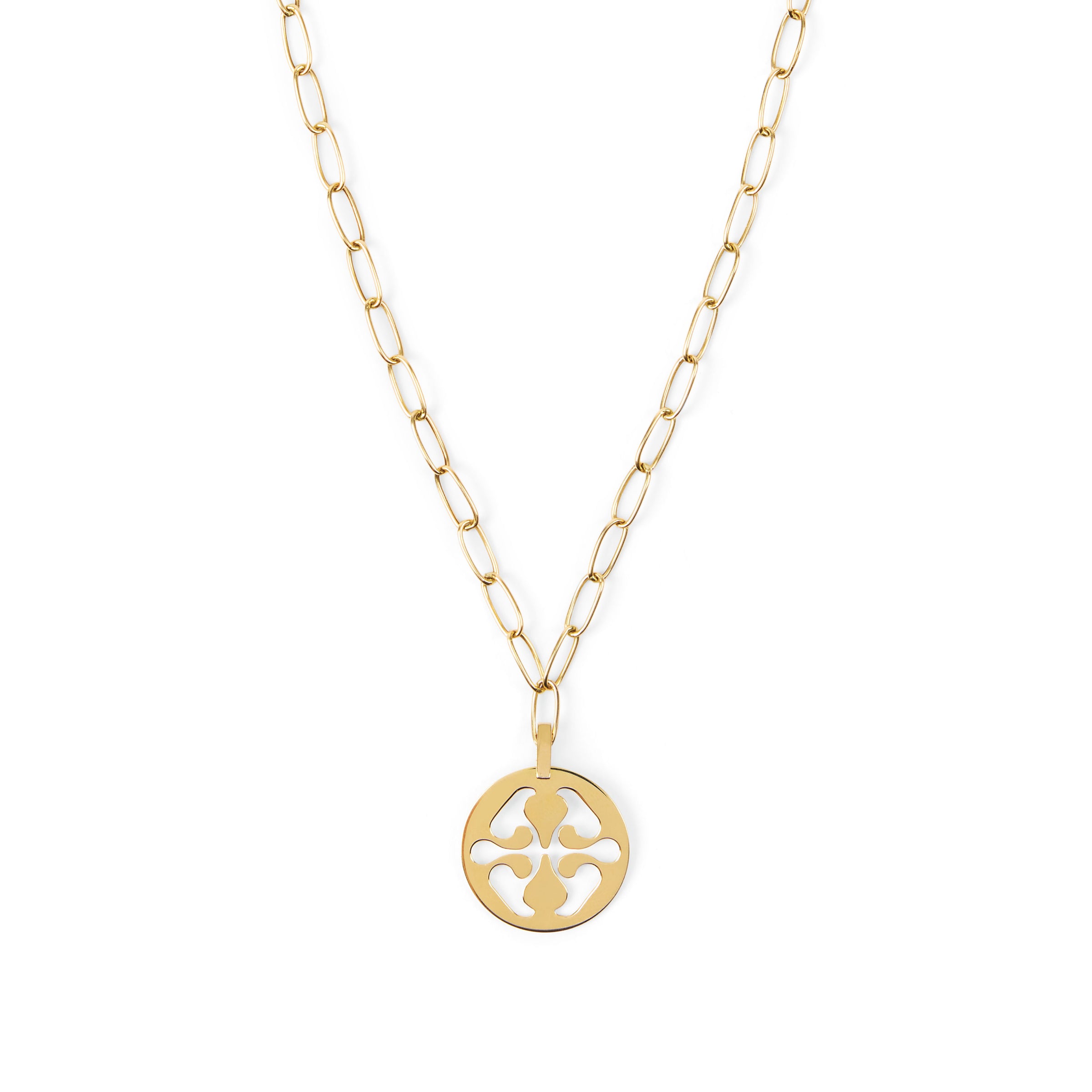 The Nomad Cosmic pendant embodies timeless sophistication, meticulously fashioned from solid 14K yellow gold with a perfectly smooth finish. Accompanied by a finely detailed 17" trace chain, this necklace exudes subtle, elegant luxury.
